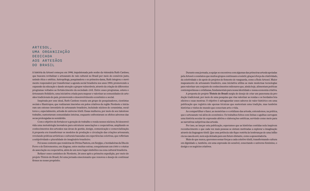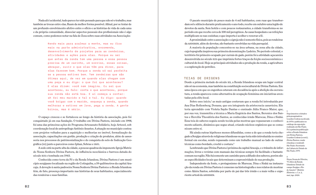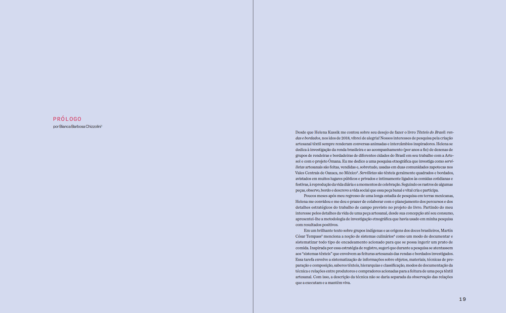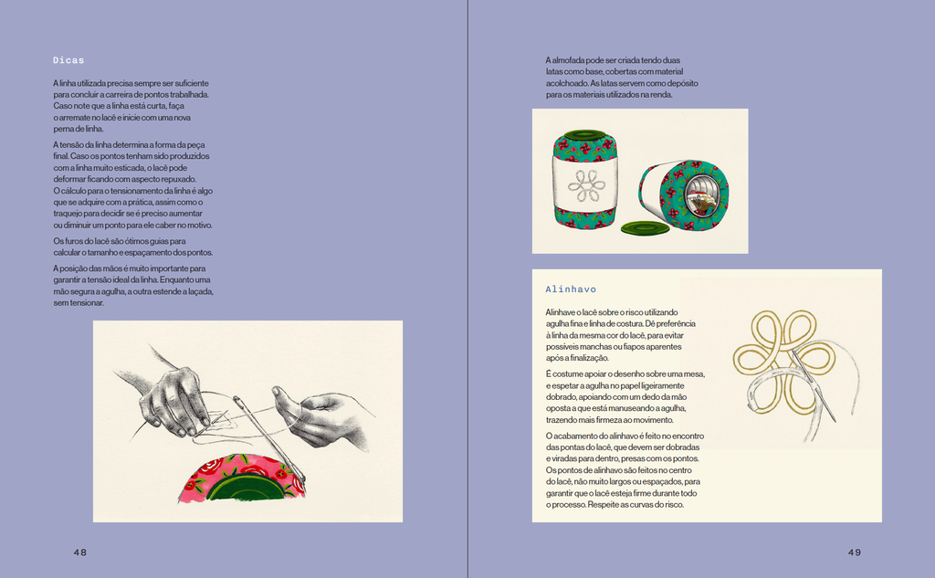 Têxteis do Brasil: Rendas e Bordados é um mergulho na riqueza das práticas têxteis tradicionais, destacando técnicas como Renda Renascença, Renda Irlandesa, Bordado Filé, Renda Singeleza, Bordado Labirinto, Bordado Redendê, Bordado Boa Noite e Renda de Bilros. Com organização e pesquisa de Helena Kussik, textos técnicos de Bianca Matsusaki, ilustrações de Camila do Rosário e fotografias de Nathália Abdalla, o livro resulta de uma extensa pesquisa de campo em comunidades de artesãs. A obra não apenas documenta essas técnicas, mas valoriza as histórias e a resistência das mulheres que mantêm vivas essas tradições. Com um olhar antropológico e artístico, apresenta os têxteis como expressões culturais dinâmicas, conectadas à identidade, à economia criativa e à coletividade.
